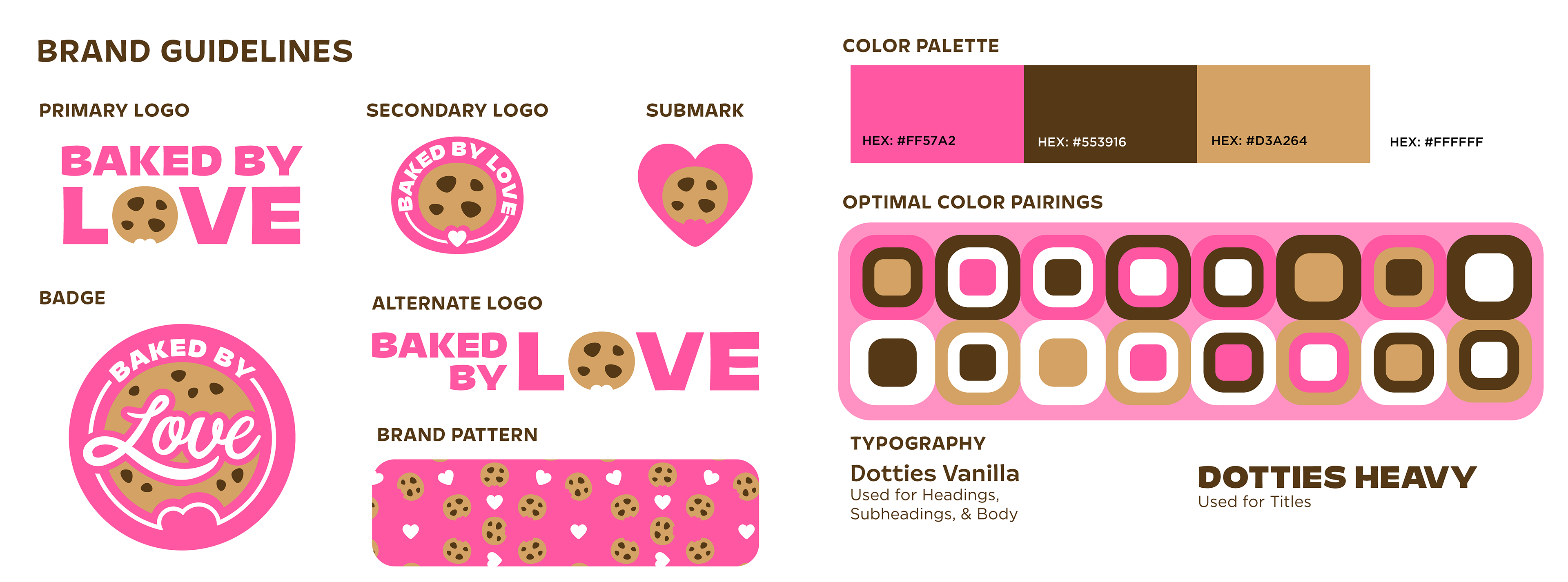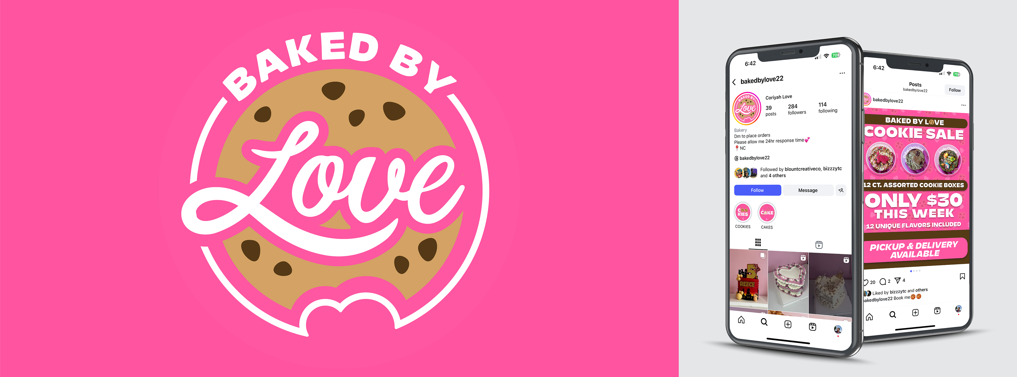 Baked by Love is a home-based baked goods business specializing in cookies, cupcakes, cakes, and dipped treats, with plans to expand into a storefront and online presence. The owner approached me to create a visual identity that would resonate with a broad audience while feeling warm, playful, and professional. I developed a scalable brand system that included a custom logo, packaging elements, and promotional graphics adaptable across digital and physical platforms. The final identity helped establish a cohesive, polished look that positioned the brand for growth and wider market appeal.
